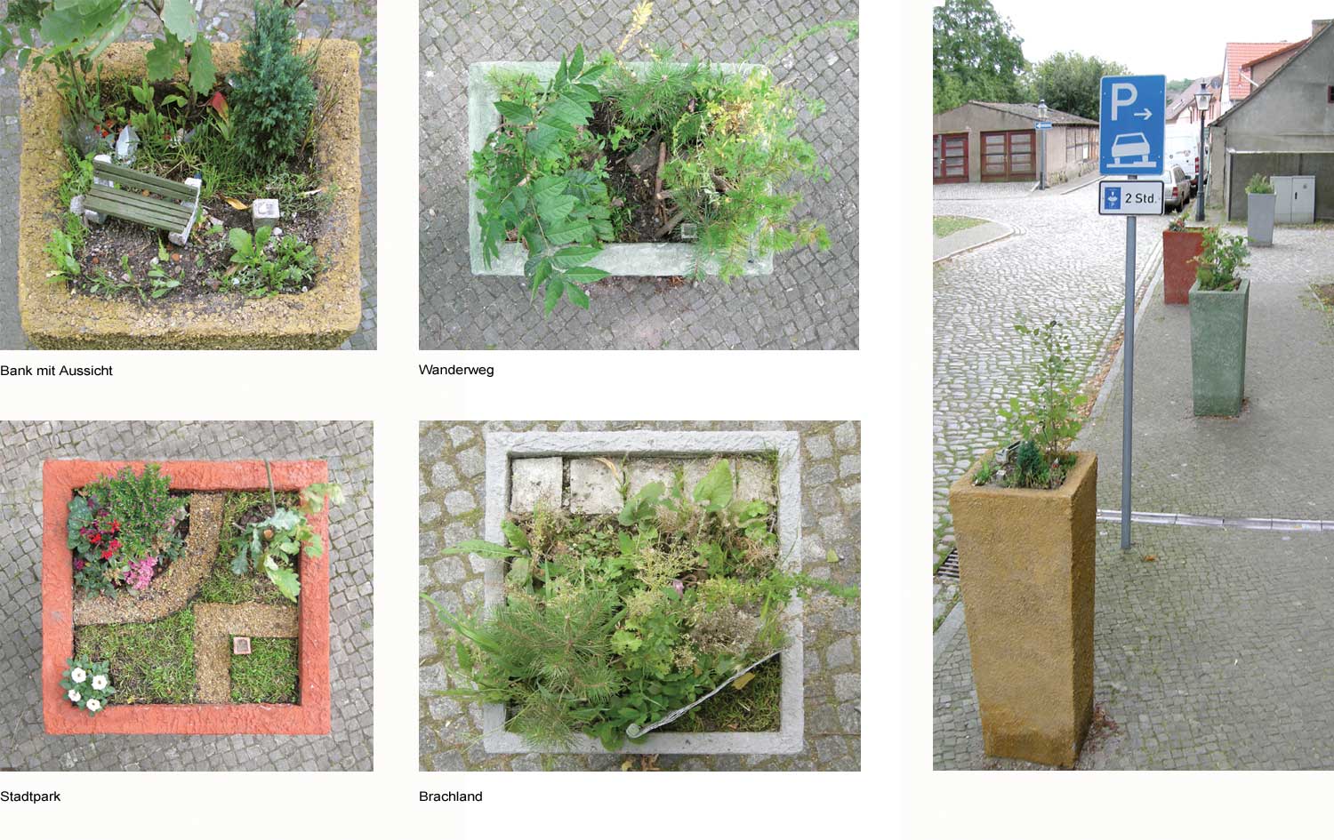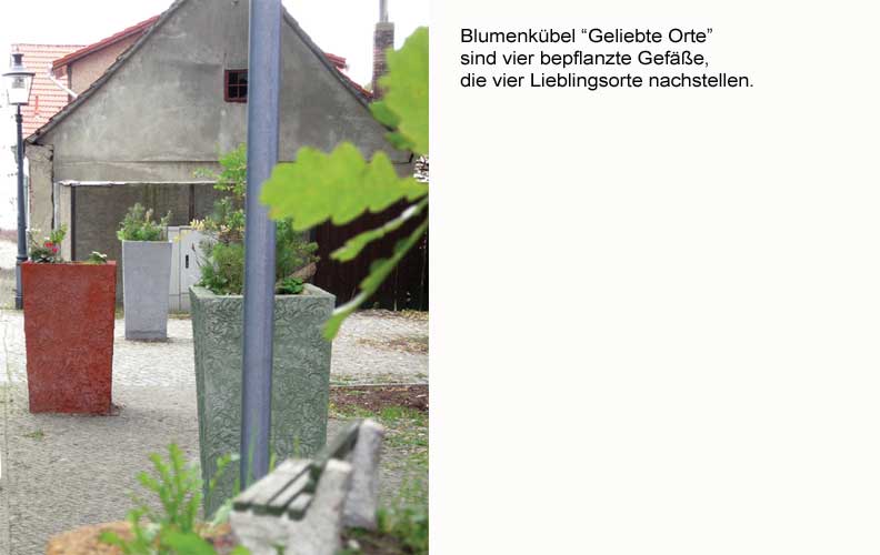 2008 Ansichten zu: Bank mit Aussicht, Brachland, ----> Stadtpark, Wanderweg, Bank mit Aussicht Die Blumenkübel sind im Rahmen der Ausstellung “Blumen für Baruth” ,2008, des Kunstvereins Alte Schule Baruth entstanden.