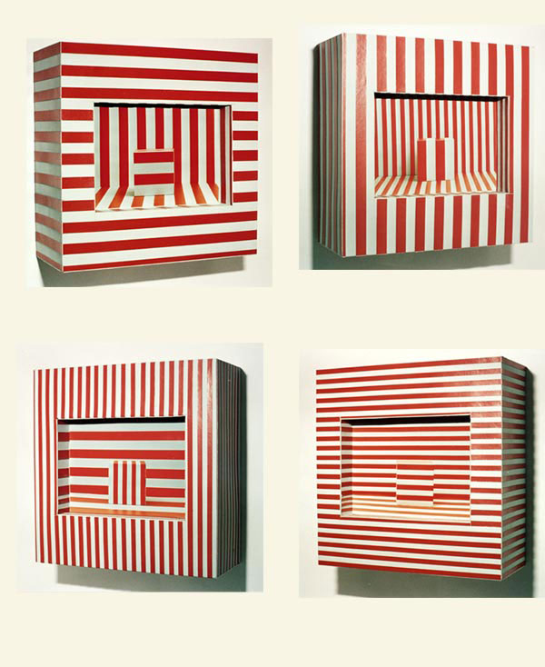 Kubenserie K06/4 107-110 Michaela, Martin, Michael, Martina (von links nach rechts) Karton beklebt mit Kartonstreifen, und Fotografie; Größe, 25x25x10 cm