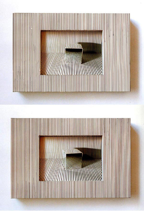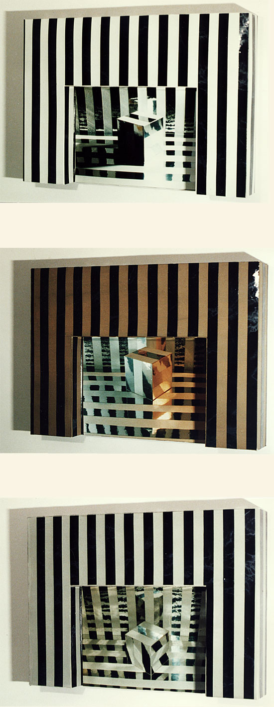 Kubenserie K12/2, 120 und 121, Frank und Robert Karton bemalt mit Tusche, und Fotografie; Größe, je 30x20x5 cm Kubenserie K30/3, 145-147, Hias, Matteo, Thaison Karton beklebt mit Folie, und Fotografie; Größe, je 29,4x21x4 cm